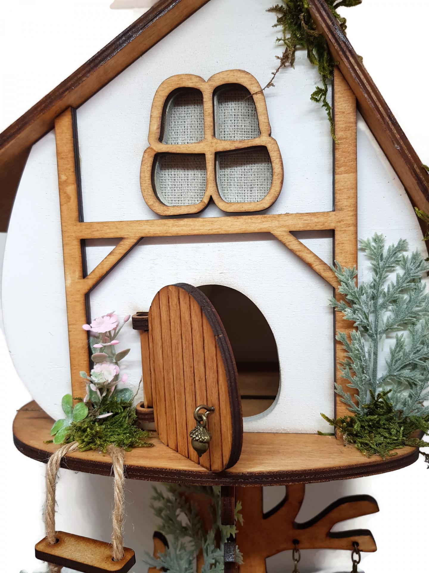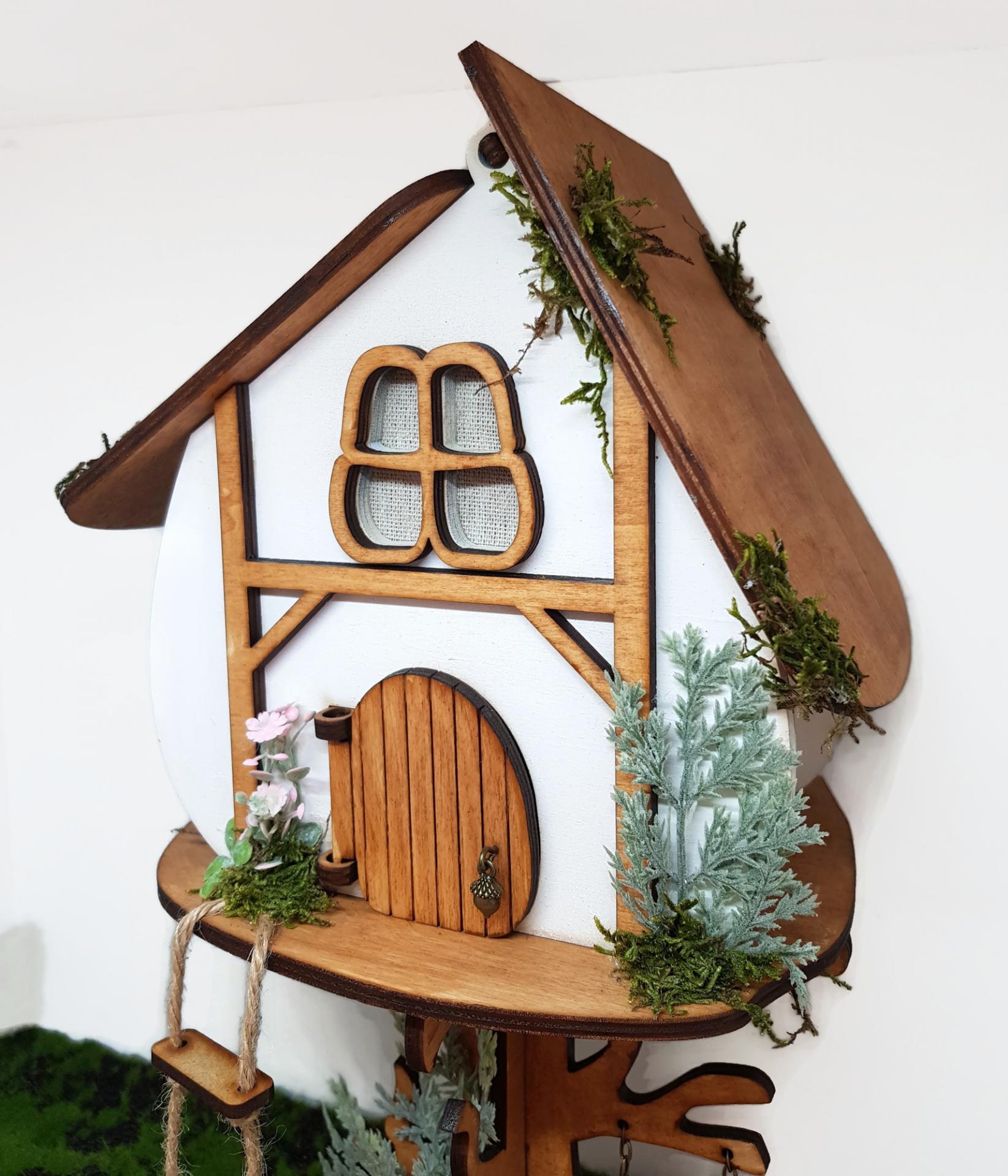 La casa cuenta con tres ventanas, letrero que cuelga de una rama, escalera por donde subirán las hadas y los duendes para irse a dormir.