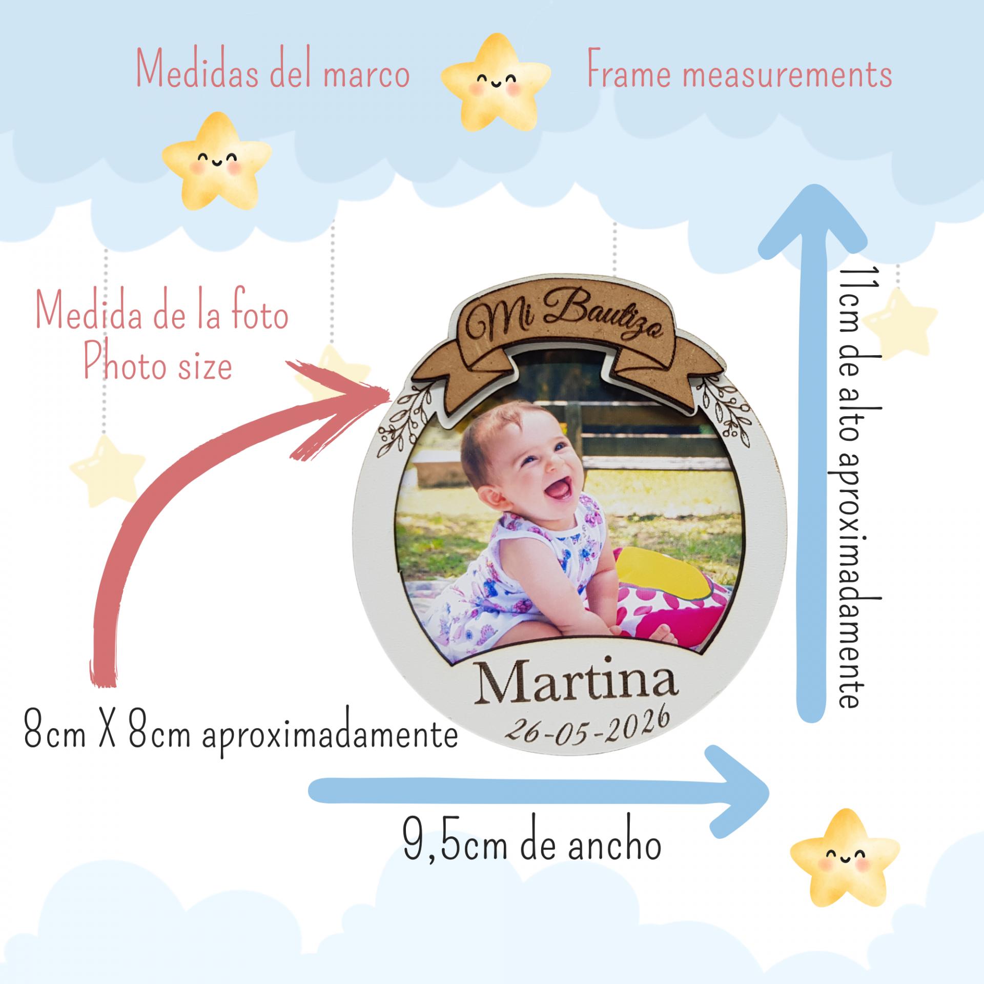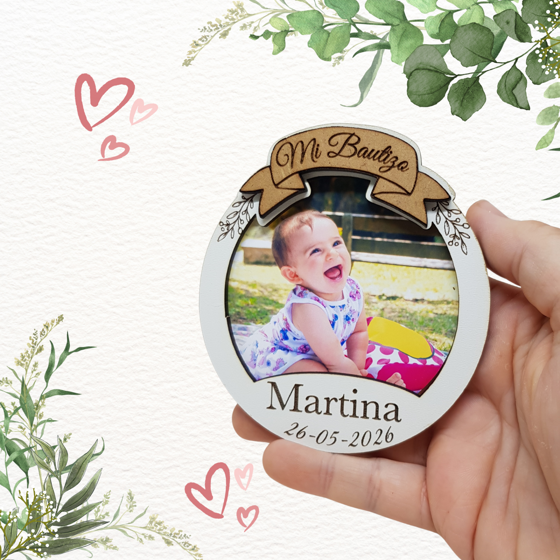 Regalo Bautizo Original, Marco Foto Imán redondo. Detalle Invitados Personalizado,Detalle comunión. Marco de madera.Baby Shower