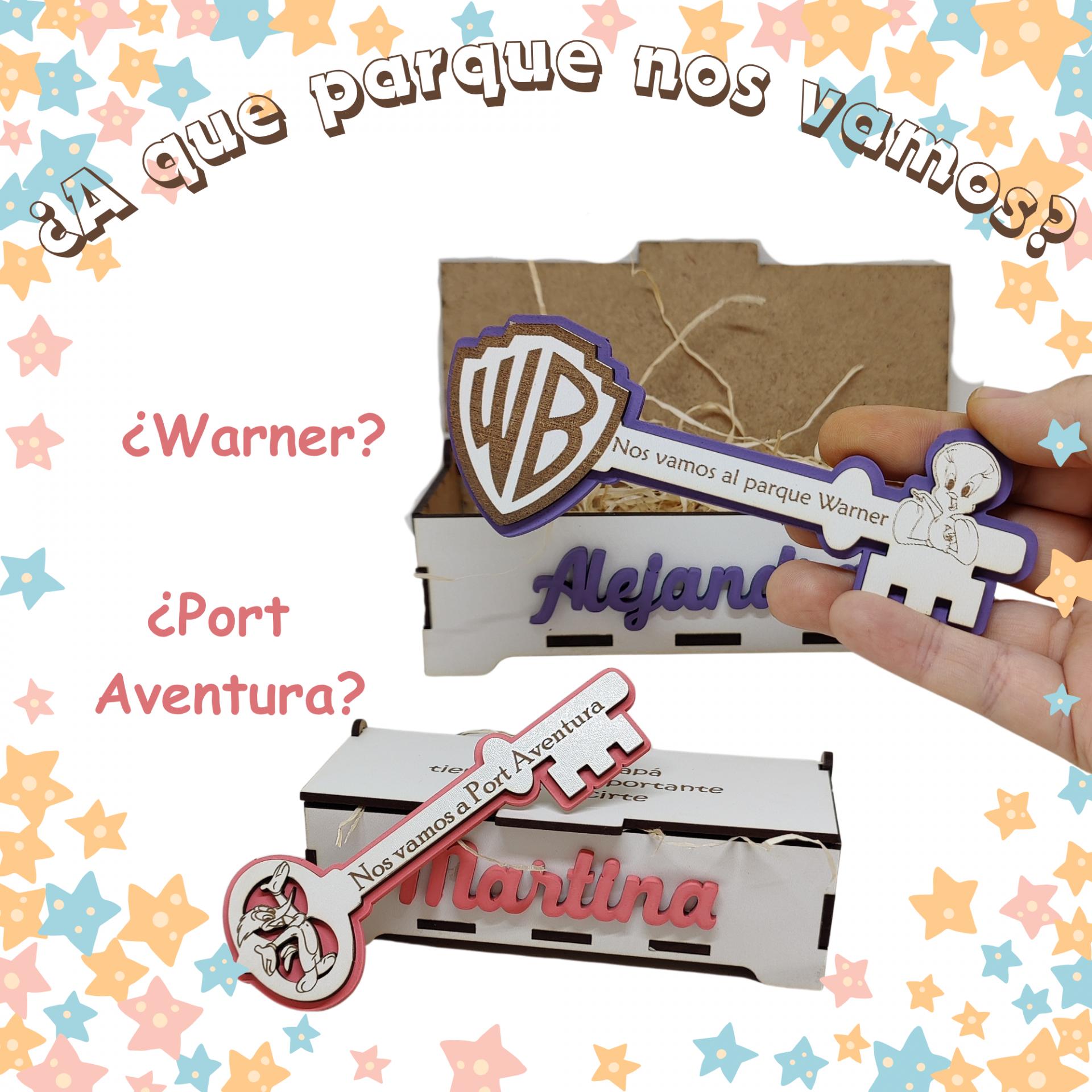 Convierte el anuncio de un viaje en un momento inolvidable con esta llave mágica de madera personalizada, pensada para sorprender a los más pequeños cuando vais a vivir una aventura especial en parques temáticos como Warner o PortAventura.