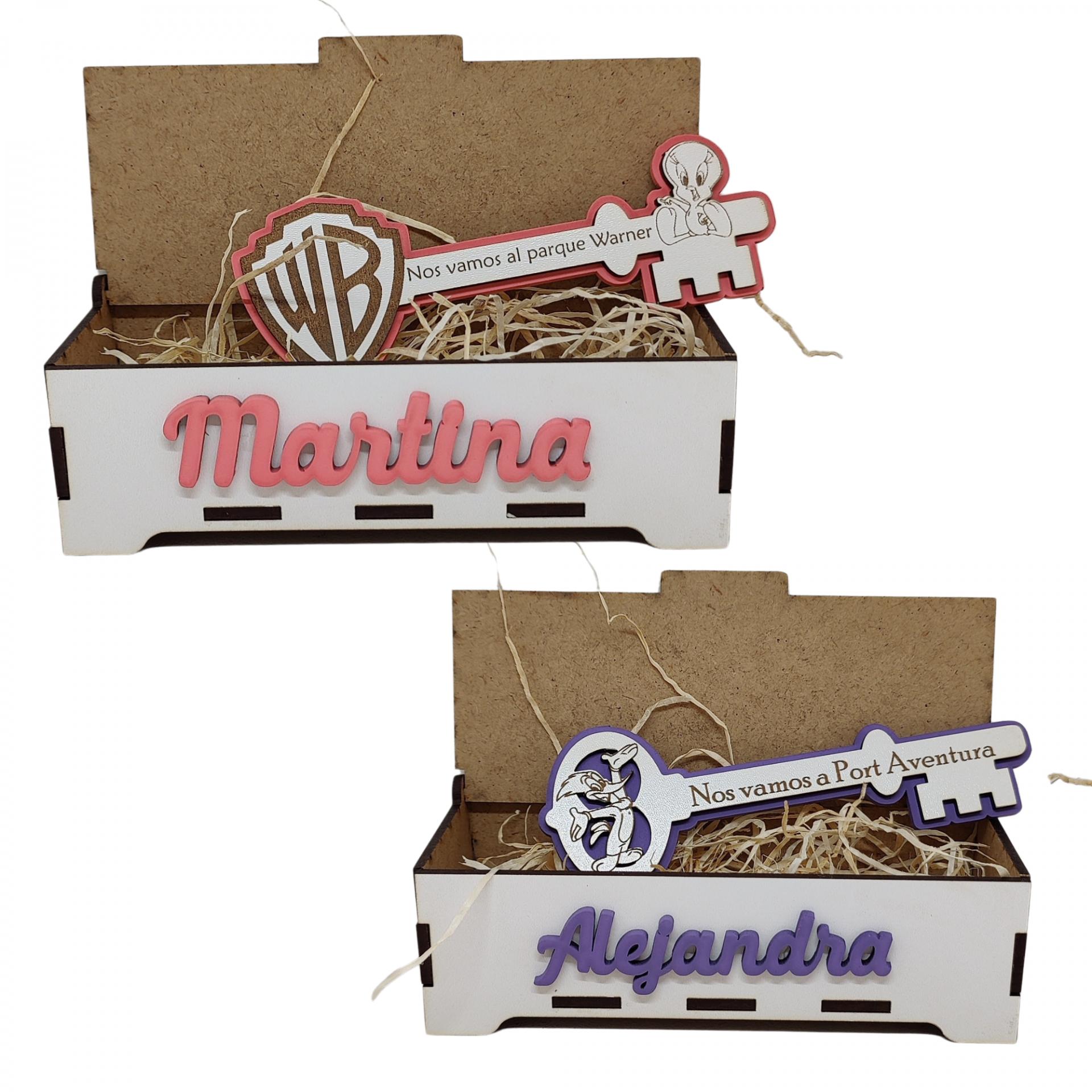 Llave personalizada de madera con caja decorativa para anunciar un viaje a parques temáticos. Un detalle emotivo y original para sorprender a los niños y crear un momento inolvidable antes del viaje.
