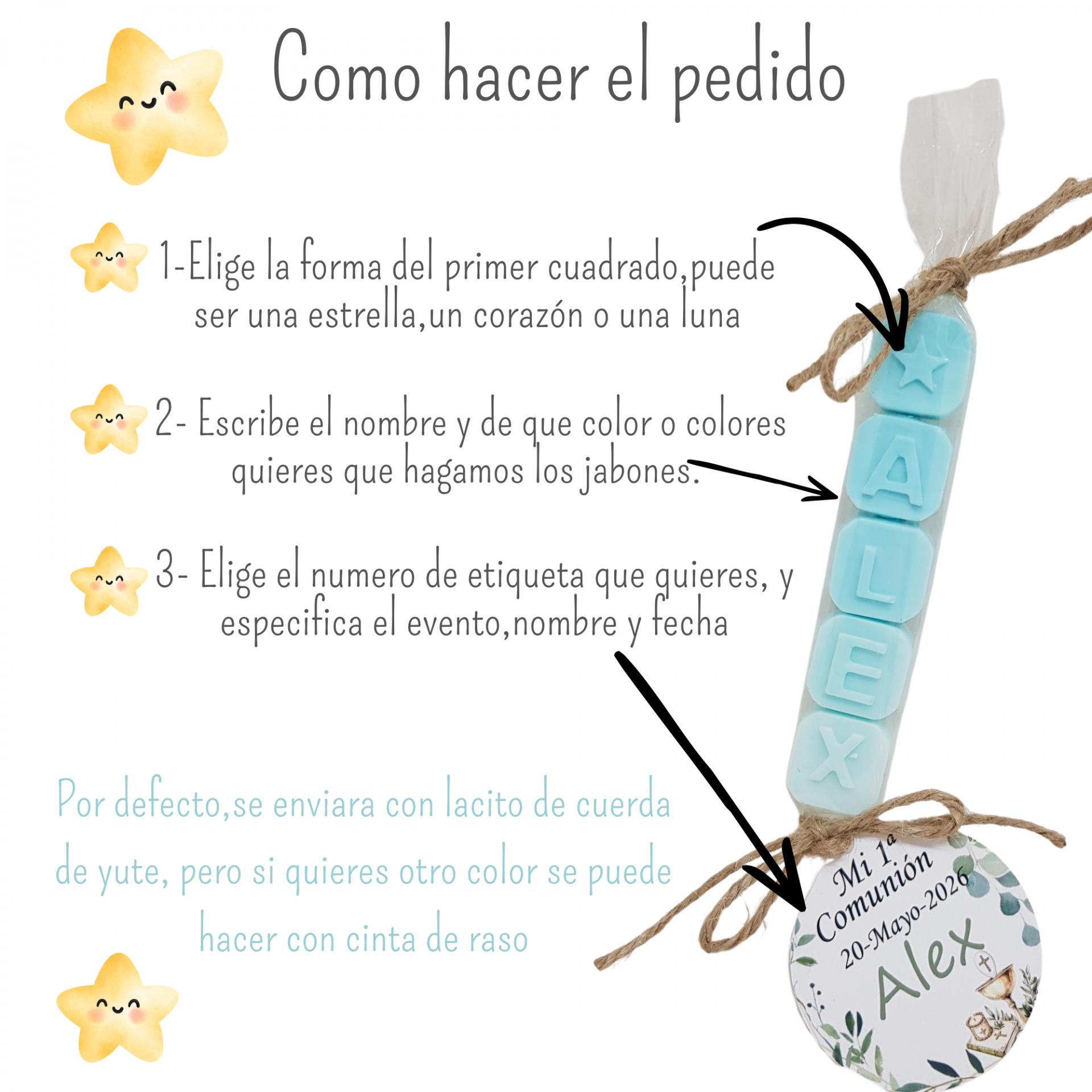 Jabones personalizados con nombre para bautizo, comunión y cumpleaños. Detalles originales para invitados con aroma, colores y etiquetas personalizadas.